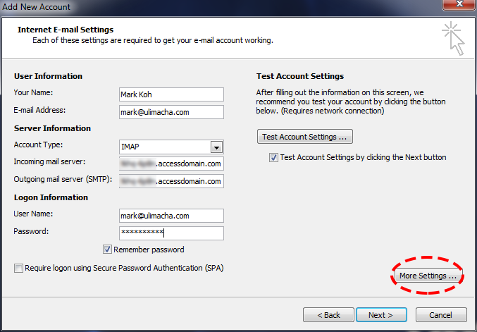 - Click More Setting ... when everything is filled up. Incoming mail server and Outgoing mail server (SMTP) are Domain Email Access (refer to your email).